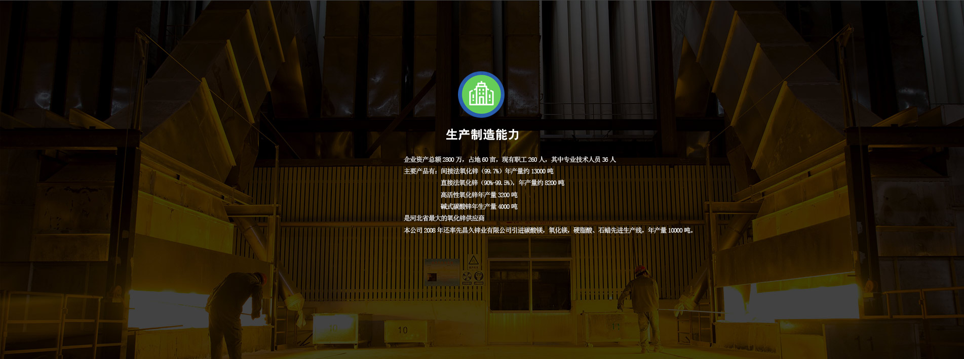 公司創(chuàng)建于1989年,公司座落在美麗的太行山下,107國道、京深高速、京廣鐵路貫穿高邑南北,交通十分便利.地理位置十分優(yōu)越. 企業(yè)資產(chǎn)總額2800萬,占地60畝,現(xiàn)有職工130人,其中專業(yè)技術(shù)人員16人,主要產(chǎn)品有間接法氧化鋅(99.7%)年產(chǎn)量約10000噸,直接法氧化鋅(90%-99.5%),年產(chǎn)量約5000噸.高活性氧化鋅年產(chǎn)量3000噸,堿式碳酸鋅年生產(chǎn)量3000噸、是河北省氧化鋅優(yōu)質(zhì)供應(yīng)商。本公司2008年還率先引進(jìn)碳酸鎂,氧化鎂,硬脂酸、石蠟先進(jìn)生產(chǎn)線,年產(chǎn)量6000噸。